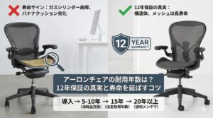 アーロンチェアの耐久性については、以下の記事で詳しく解説しています。12年保証の意味や寿命について知りたい方は参考にしてください。